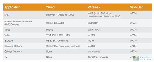 然后,wPCIe还可以帮助用户扩展全新的接口。例如一台老旧电脑只有USB2.0接口,不支持全新的USB3.0和e-SATA接口。如果用户想使用这两个接口的设备,要么升级主板,要么利用扩展卡进行扩展,但前者投入太高,后者在速度上又很难达到新接口的标准。而应用wPCIe技术后,用户只需要购买带有这些新接口的 “DockingZone”扩展底座,就可以轻松享受新设备带来的便利。wPCIe 7Gbps的带宽完全可以满足主流外设的基本带宽需求。