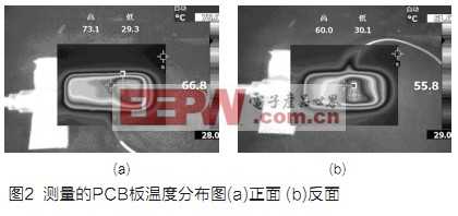 热源器件的功耗分析、热源器件的热距离布局面积计算以及热源器件的环境温度分析都完成后就可以开始PCB的布局了,PCB的布局需要遵循最基本的热设计原则,如:热点分散;将最高功耗和发热最大的器件布置在散热最佳位置;不要将发热较高的器件放置在印制板的角落和四周边缘;高热耗散器件在与基板连接时应尽能减少它们之间的热阻等,另外还要按照上面计算的压缩热间距布放热源器件,在热源器件的压缩热间距内尽量少布器件,更不能布放发热器件,热源器件的背面也要尽量少布器件,更不能布放发热器件。图1为本项目的最终PCB版图,图2为其温度测量图。由图可见,本设计方法是实用的。