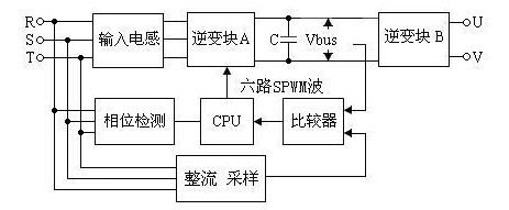 每个功率单元结构上完全一致,可以互换,其主电路结构有图2所示,为基本的交-直-交双向逆变" title="逆变">逆变电路。图中通过整流桥进行三相全桥方式整流,整流后的给滤波电容充电,确定母线电压,通过对逆变块B中的IGBT逆变桥进行正弦PWM控制实现单相逆变。当电机进入发电状态后,逆变块B中的二极管完成续流外,又起全波整流,使能量能够转移到滤波电容中,结果母线电压升高,达到一定程度后,启动逆变块A,进行SPWM逆变,通过输入电感,返回到移相变压器的次极,通过变压器将能量回馈到电网。