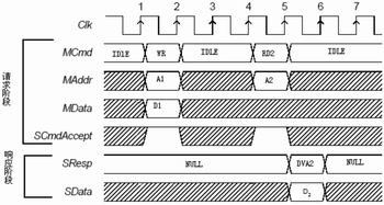 在上升沿1处OCP Master方通过将MCmd由Idle变为Wr开始进入请求状态,在此周期内把地址A1和数据D1分别送到MAddr和MData信号线上,Slave必须在同一个周期内发出SCmdAccept有效信号;Slave在上升沿2处开始接收地址和数据并进行内部写操作;在上升沿4处MCmd赋值为Rd,OCP进入读请求状态,在这个周期内Master方将地址放在MAddr信号线上,在同周期Slave发出SCmdAccept有效信号;在上升沿5处Slave方置SResp为DVA从而开始响应阶段,请求阶段结束,根据从MAddr获得的地址读取数据并放到SData信号线上;在上升沿6处开始Master方收到Slave的响应信号并开始读数据,响应阶段完成。