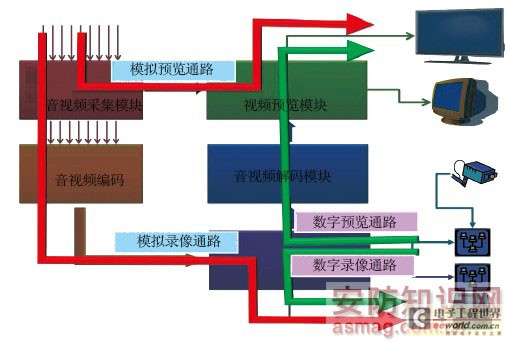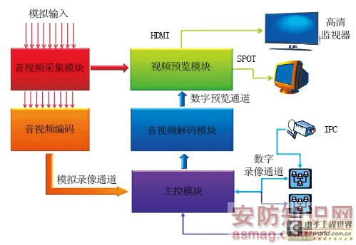 和DVR的基本功能一样,HVR的核心功能也是数字录像、预览回放等。由于加入了数字通道(数字通道的处理方式和模拟通道的处理方式完全不同),因而对比传统的DVR架构有所扩展(图1)。