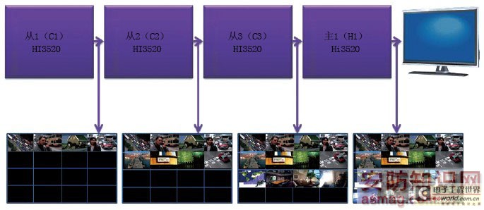 在DVR和HVR系统中,对录像和预览回放的处理方式是不一样的,比如全D1的录像机,它的录像通道就是D1大小,是不变的;而预览和回放不一样,需要根据用户的设定来改变,比如在一个1920×1080的显示器上,用户可以将屏幕划分成多个子窗口,一般有36、25、16、9、8、4、1等划分方法,也称之为layout方式。首先,主控芯片H1根据客户规定的layout方式发给每片处理器。每片处理器将采集或者解码得到的视频数据进行缩放,再放到规定的layout子窗口内。然后,将合成的视频从级联输出口输出,随着视频从C1传到C2、C3,最后传到H1。H1贴好自己的layout子窗口后,整个预览视频就完整了,通过MDIN340这颗HDMI驱动器,将视频完整地显示在监视器上,如图5所示。从HVR系统的主要使用方式来分析一下数据流向,探究该视频级联模式的视频预览回放级联模式的具体运作。
