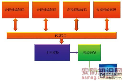 对比NVR,HVR增加了模拟视频接入和编码的功能;而相对DVR,HVR强化了音视频解码和数字接入部分功能,功能的丰富带来的是系统复杂性的增加。如果要构建一个模拟16路D1+数字16路D1的HVR,现有的单片芯片基本上都没有如此强大的编解码能力,那就要以处理芯片的级联来实现。传统的芯片级联的方式通常通过PCI或者PCIE接口来实现,而大多媒体处理芯片将编码和解码的功能做在一起,如下图3。而HVR遇到的困惑就是:视频预览模块挂在主控模块上,所有解码后的原始数据都从PCI给主控,再由主控输出到监视器,这样给主控模块造成了很大的压力。