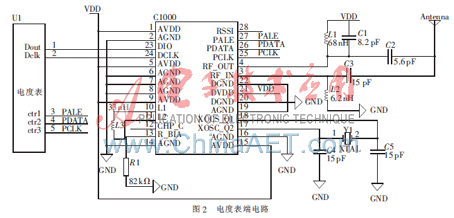 电度表端电路(如图2)采用Chipcon公司的无线收发芯片CC1000。CC1000可以在315/433/915 MHz ISM(工业、科学和医疗)频带系统上应用,采用FSK调制,可采用3.3 V电源供电。芯片内部的T/R切换电路简化了天线连接和匹配电路设计,通过编程可方便选择芯片的工作频带,输出功率可编程。该芯片具有28个管脚,其中,PALE、PDATA、PCLK是芯片的可编程串行接口,通过该接口可对芯片的36个配置寄存器执行读写操作。DCLK、DIO用来与电度表交换数据,其中DCLK为数据传输的时钟,由CC1000提供。