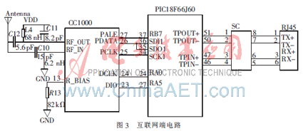 互联网端采用CC1000实现无线收发,为了简化电路设计,天线采用印制电路板天线,无线收发距离通过单片机写CC1000的功率控制寄存器进行配置。互联网接口电路采用具有以太网模块的单片机芯片PIC18F66J60,该单片机具有64 KB内部Flash存储器,因而不需要扩展EEROM即可实现程序和数据的永久保存。这款单片机集成MAC和10 Base-T PHY,支持10 Base-T端口,在发生冲突时可编程自动重发,并可拒绝错误数据包,并且它具有完整的网路连接解决方案,外加两个脉冲变压器和一些无源器件即可与以太网连接。此外,PIC18F66J60具有一个主同步串行口模块,支持SPI和I2C两种模式,本文中使用SPI模式配置无线收发芯片。单片机与无线收发芯片的接口通过SPI口和两个普通I/O口实现,TPIN+、TPIN-、TPOUT+、TPOUT-这四个引脚是单片机的以太网模块专用信号接口,单片机通过这四个引脚外加一些外部元件(图3中SC模块)与互联网连接。