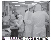 与传统IC行业注重二维静止的电路设计不同,MEMS以理论力学为基础,结合电路知识设计三维动态产品,对于在微米尺度进行机械设计会更多地依靠经验,设计开发工具(Ansys)也与传统IC(如EDA)不同,MEMS加工除使用大量传统IC工艺,还需要一些特殊工艺,如双面刻蚀,双面光刻等。MEMS较传统IC工艺简单,光刻步骤少,MEMS生产有一些非标准的特殊工艺,工艺参数需按产品要求进行调整,由于需要产品设计、工艺设计和生产三方面的密切配合,IDM的模式要优于Fabless+Foundry(无芯片生产线公司+代工厂)的模式。MEMS对封装技术的要求很高。传统开云棋牌官网在线客服厂商的4英寸生产线正面临淘汰,即使用来生产LDO也只有非常低的利润,如转而生产MEMS则可获较高的利润;4英寸线上的每一个圆晶片可生产合格的MEMS压力传感器Die 5~6千个,每个出售后可获成本7~10倍的毛利(图10);转产MEMS改动工艺不大、新增辅助设备有限,投资少、效益高;MEMS芯片与IC芯片整合封装是IC技术发展的新趋势,也是传统IC厂商的新机遇。图11是MEMS在4英寸圆晶片生产线上。