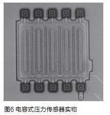 电容式压力传感器利用MEMS技术在硅片上制造出横隔栅状,上下二根横隔栅成为一组电容式压力传感器,上横隔栅受压力作用向下位移,改变了上下二根横隔栅的间距,也就改变了板间电容量的大小,即△压力=△电容量(图5)。电容式压力传感器实物如图6。