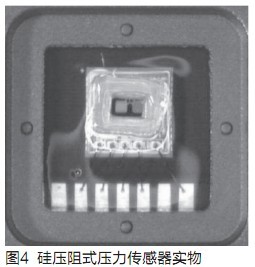 MEMS硅压阻式压力传感器采用周边固定的圆形的应力杯硅薄膜内壁,采用MEMS技术直接将四个高精密开云棋牌官网在线客服应变片刻制在其表面应力最大处,组成惠斯顿测量电桥,作为力电变换测量电路,将压力这个物理量直接变换成电量,其测量精度能达0.01%~0.03%FS。硅压阻式压力传感器结构如图3所示,上下二层是玻璃体,中间是硅片,硅片中部做成一应力杯,其应力硅薄膜上部有一真空腔,使之成为一个典型的绝压压力传感器。应力硅薄膜与真空腔接触这一面经光刻生成如图2的电阻应变片电桥电路。当外面的压力经引压腔进入传感器应力杯中,应力硅薄膜会因受外力作用而微微向上鼓起,发生弹性变形,四个电阻应变片因此而发生电阻变化,破坏原先的惠斯顿电桥电路平衡,产生电桥输出与压力成正比的电压信号。图4是封装如IC的硅压阻式压力传感器实物照片。