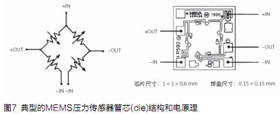 典型的MEMS压力传感器管芯(die)结构和电原理如图7所示,左是电原理图,即由电阻应变片组成的惠斯顿电桥,右是管芯内部结构图。典型的MEMS压力传感器管芯可以用来生产各种压力传感器产品,如图8所示。MEMS压力传感器管芯可以与仪表放大器和ADC管芯封装在一个封装内(MCM),使产品设计师很容易使用这个高度集成的产品设计最终产品。