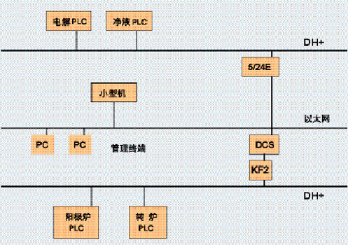 金隆公司的生产管理网络就是这样一个集控制和管理于一体的厂级分布式控制系统,网络构成如下图所示。