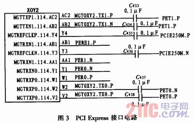 利用具有PCI Express的FPGA来设计,选用Xilinx公司的Virtex-5 LXT系列的FPGA,利用其内的PCI Express IP核进行设计,完成功能如下:用户接口的本地链路成帧接口;64位数据总线宽度与3位提醒总线;包化接口,带用于标记包的帧起始(SOF)和帧结束(EOF);传输和接收方向用户接口的包中断特性;帧错误检测支持;多通道配置支持:×1、×2、×4和×8;这里通道配置为×1;每通道1.62 Gb/s或更高的吞吐量;利用集成端点模块中的自动协商功能,可以在某些通道不能工作时使设计使用较低的带宽;物理层中使用的8B/10B解码和解码。此方案虽开发难度大、周期长,但具有外电路围简单,硬件成本低,设计灵活、集成度高且易升级等特点。其接口电路如图3所示。