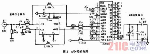 A/D转换电路是整个系统的重要组成部分。对前端输出约-25~25 mV,带宽为20 MHz的射频信号数字化,设计采用模数转换器芯片AD9235,最大采样率40 Mb/s,12 bit数据输出,信噪比RSN=70 dB。AD9235是差分输入,单端信号输入需要A/D驱动芯片,选用低失真差分A/D驱动芯片AD8138,图2为A/D转换电路,AD9235模拟输入设置在2VPP,参考电压VREF采用内部1 V参考电压,同时还作为驱动芯片AD8138的共模电压。利用AD8138对输入信号进行放大,放大倍数RF/RG=2.49 kΩ/820 Ω≈3。因此,经过AD8138单端差分转换及放大输入信号范围为25~175 mV。