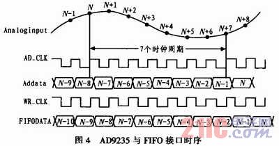 AD9235与FPGA接口设计应仔细考虑ADC转换时钟、FIFO写时钟及所选中间逻辑器件的时序和延时特性,以保证正确地设置采样时钟。AD-9235的采样数据在延时7个采样周期后出现在数据线上,图4为A/D与FIFO接口时序。