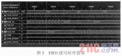 FPGA内部的异步FIFO数据总线与TMS320C6201的数据总线相连,应注意数据采集与TMS320C6201访问外设间的总线冲突。应保证没有长时间占用数据总线的外部设备,否则造成采集数据丢失。