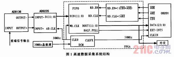 如果A/D直接与DSP的外部存储接口EMIF连接,会使DSP的负荷过重,另一方面DSP还需扩展外设,与采样输入共用一条外部总线,进行外部设备的读写,不允许数据采集始终占用外部总线。如果不能及时接收数据,上次存储的数据会被覆盖,造成数据丢失。异步FIFO能实现不同时钟域的数据传输,可将它作为A/D转换器和EMIF之间的桥梁,每写入一块数据,便通知EMIF从FIFO取走数据。基于以上分析,图1为高速数据采集系统结构框图。