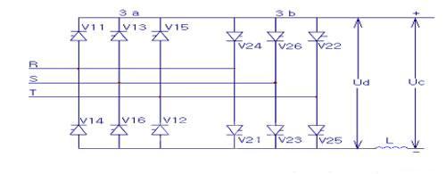 3a:正桥3b:反桥L:中间电路电抗器 V11-V16:正桥晶闸管V21-V26:反桥晶闸管 Ud: 晶闸管供电单元直流电压 Uc:中间直流电路电压 图二 TSU主电路