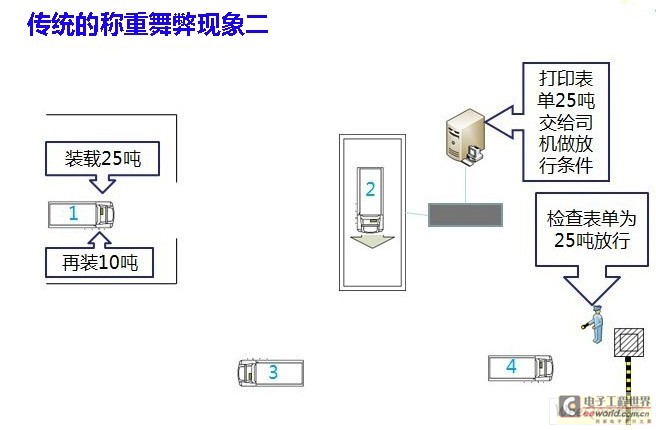 如图2所示,虽然车辆正确上磅,准确计量出货物重量,但车辆很快返回仓库再次装货10吨,并绕过再次称重环节,凭先前开出的《称重表单》顺利出厂,企业不知不觉中损失10吨货物。