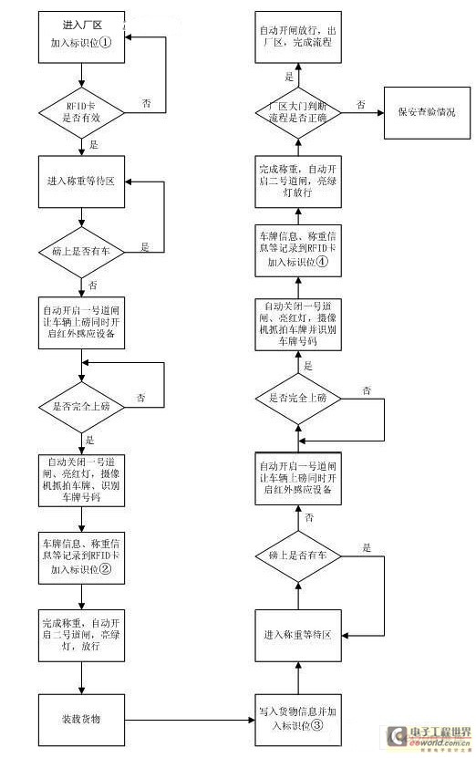 1.空货车进厂区,运输车辆拥有RFID卡,该卡允许进入厂区,加入标识位①后放行。