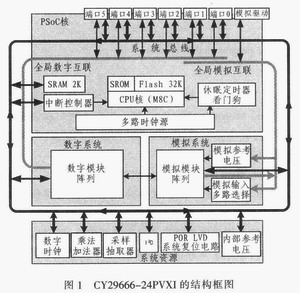 4)虽然也可将PSoC视为1个8位的微控制器,即8位单片机。但是与一般单片机不同的是,它几乎不需要外部电路,一片PSoC就可实现一个电子系统。而且PSoC具有比一般单片机更多的内部资源,如低电压监测电路(Low Voltage Detect,LVD)、开关式升压泵(Switch Mode Pum-p,SMP)、内部精密参考电压(Intemal Voltage Reference)等。另外,PSoC同时具有片内和片外系统时钟源,可以不需要外部晶体振荡器即可自行工作。