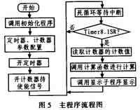 系统首先用8位定时器Timer8通过中断方式产生准确时间,而后调用计数子程序对光纤陀螺脉冲输出进行计数,最后调用显示子程序将采样结果在LCD上显示出来。其软件流程如下图5所示。