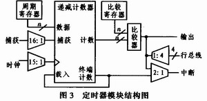 脉冲采集模块由定时器模块和计数器模块组成。PSoC芯片嵌入了强大的定时器功能模块。它拥有8位、16位、24位和32位可编程递减定时器。通过对定时器模块编程,用户可实现多种工作方式的定时器功能。PSoC的定时器模块由1个周期寄存器、1个同步递减计数器和1个捕获比较寄存器组成,结构如图3所示,每个寄存器大小都是1个字节。当定时器不工作时,向周期寄存器(Period Register)写入一个周期值。当定时器工作时,周期值会被自动从周期寄存器中载入到递减计数器(Down Counter)中,随后,计数器将会执行递减计数操作直到0。在下一个时钟上升沿,周期值将会被重新载入,紧接着继续计数。递减计数器模块主要的功能是输出信号,它可以被配置成全时钟循环或者半时钟循环。定时器具有定时、比较和捕获比较3种功能。本系统中运用其定时功能。原理如下:将系统的数字时钟或其他输入信号作为Clock,通过设置Period值即可获得相应的定时间隔,定时间隔T=(Period+1)/fClock。当递减计数器值减为0时,定时器时间到,此时Terminal Counter Out将输出一个高电平脉冲,若设置了中断,则将产生定时器中断。