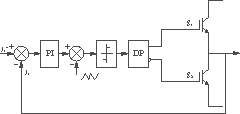 滞环PWM电流控制是一种较为传统的控制方法,其结构如图3所示,DP为上下桥臂驱动电路,KH为滞环比较器。滞环比较方式的特点是采用硬件电路比较,电路结构简单,稳定性好,电流控制的响应很快,误差可控,但输出电流的谐波较多,电磁噪声较大。
