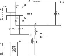 二次为桥式整流电路如图4所示。图中D1,D2,D3,D4为主整流管;D11及D12为毛刺吸收电路专用二极管。Lo与Co为主整流电路中的电感和电容;C为毛刺能量储存电容。L,S,D组成毛刺能量转换释放电路。主变压器中绕组CD和脉冲转换电路一起形成S的开关控制脉冲ugs,与绕组AB形成固定的相位关系。绕组AB的电压uAB波形与S上的驱动脉冲波形示于图5。