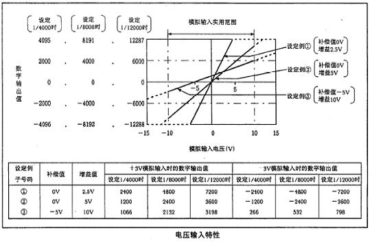AD变换后的输出值,按通道分别被存储到缓冲区地址10~13,数字量输出值是带16位符号的二进制,分辨率以设定的1/4000时为-4096~4095,设定1/8000时为-8192~8191,设定1/12000时为-12288~12287来表示。