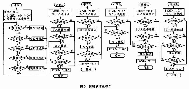 在图中,PC104 CPU通过数据总线、地址总线、读、写信号线与I2C接口模块相连,I2C接口模块则通过SDL、SDA与X24C04相连,PC104CPU输出的并行数据,经过I2C接口模块转换后变成符合I2C总线模式要求的串行数据输出到X24C04,X24C04输出的串行数据经过I2C接口模块转换后,变成并行数据供PC104CPU读取。使用该模块后CPU操作I2C总线就像操作并口一样方便。该电路的控制软件流程如图5所示。