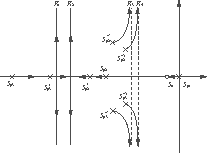 ×2时,此时等效负载R较大,系统极点sp2,3为一对共轭复数,系统根轨迹如图4所示(R3,R4对应的根轨迹)。根轨迹的渐近线σa=