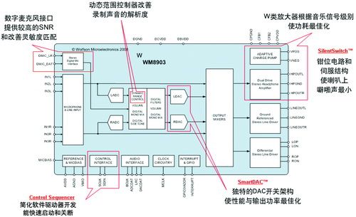WM8903功能框图示于图1,其特点如下: