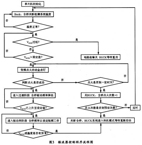 由金卤灯特性曲线可知其点火成功后会进入一个过渡阶段。过渡阶段可分为两个阶段,第一个阶段为低压维持阶段,灯两端电压会骤降并维持在一个较低的水平;而在第二个阶段,灯两端电压开始逐渐升高直至其稳态工作电压。所以,开始产生全桥驱动信号后,控制电路将继续检测 Buck 输出电压,并当检测到该电压小于某一设定值时,认为金卤灯点火成功,镇流器可通过改变全桥工作频率来减少其输出电压中的脉冲尖峰干扰。当控制电路检测到 Buck 输出电压开始上升至相应设定值时,系统将再次设定全桥工作频率为稳定工作频率。