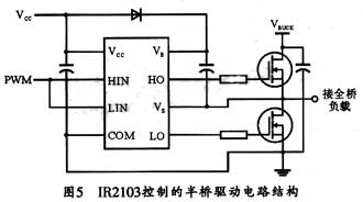 设计中的全桥电路采用两个半桥驱动芯片 IR2103 来为全桥逆变电路中的四个 MOSFET 提供两路互补方波驱动信号。 IR2103 为高压高速大功率 MOS 管及 IGBT 驱动器,它拥有独立的高、低参考电平输出通道,驱动设计逻辑十分简单,易于软件程序流程设计,十分适用于低成本的电子镇流器。每一片 IR2103 可分别驱动全桥的一对上、下桥臂,其半桥驱动电路结构如图 5 所示。 IR2103 所需的 PWM 控制信号可由 STC 12C 5410AD 单片机提供。
