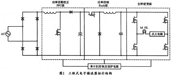 低频方波驱动金卤灯方案应用最为广泛的是三级式电子镇流器,其基本构成如图 1 所示。第一级功率因数校正电路 ( 即 APFC 电路 ) ,可在减小电流谐波,提高功率因数的同时,为其后的功率控制级电路提供恒定的直流母线电压。本设计采用 Boost 电路结构形式来提供较高的母线电压,以利于产生驱动金卤灯的高压点火脉冲。第二级功率控制电路为 Buck 电路,用于实现金卤灯的稳态控制,主要是指恒功率控制。所谓的恒功率控制就是保证金卤灯在正常工作时,输出功率保持不变。恒功率下金卤灯的光输出及相关色温指数均会十分稳定,不仅可以保证照明质量,同时也可以延长金卤灯的使用寿命。在稳态工作时, Buck 电路会将金卤灯工作电流调整为一稳定值,同时, APFC 电路会输出恒定直流母线电压,从而实现金卤灯的恒功率控制。第三级电路为全桥逆变电路,它可将 Buck 电路的输出电压逆变为低频方波来驱动 HID 灯,从而避免声谐振现象的发生。金卤灯的启动需要通过高压脉冲点火来实现,图 1 中的点火电路主要利用 LC 谐振的方式来产生高达数千伏的高压脉冲,从而完成金卤灯的启动。图 1 中的单片机控制与保护电路的功能主要是完成金卤灯的启动控制以及金卤灯稳定工作时的监测和保护,确保整个系统的正常运行。