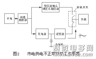 当市电供电不正常时如图2所示,连接电网的转换开关关断,连接逆变器的转换开关开通,逆变器在蓄电池组所提供的直流能源支持下,向用户提供50Hz、220V正弦波交流稳压电源,同时充电器停止工作。