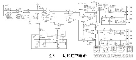 晶闸管的通断是由MR16单片机辅以切换控制电路实现的。当电网故障时,先发出切断电网信号,再发出切入逆变器的信号;当电网恢复时,先发出切断逆变器信号,再发出切入电网的信号,这就需要信号发送电路,同时控制晶闸管开、关也需要门极触发驱动电路。切换控制电路如图5所示,图5中左边PTC0、PTC6两路端口就是MR16单片机发送的开关控制信号,经光耦隔离送到由或非门组成的基本RS触发器电路中,RS触发器输出的两路信号是互锁的,两者只能同时为低电平(关断信号),不能同时为高电平(开通信号),从而增强了系统的安全性。由555定时器组成的自激振荡器的作用是定时地发送触发脉冲,脉冲有效宽度应不小于晶闸管的开通时间,其输出信号与RS触发器的输出相与送到门极驱动电路中。图5中后级则是晶闸管的门极脉冲驱动电路,可以看出也是隔离输出的。另外,采用两个LED管用于显示负载采用的供电方式。