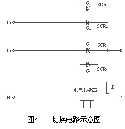 切换控制是通过通断切换电路中的静态电子开关(如晶闸管模块MTC)来实现的。本系统选用MTC70(70A/1200V)的晶闸管,如图4所示,图4中L1为电网进线,L2为逆变器进线,N为两者的公共地线,R为负载。图中采用晶闸管反并联连接,由于母线上流过的是正弦全波,以SCR1及SCR2为例,就必然形成在正弦波的正半周SCR2导通、SCR1关断,在负半周则SCR1导通、SCR2关断,这样就保证了流过负载的电流是完整的正弦波。