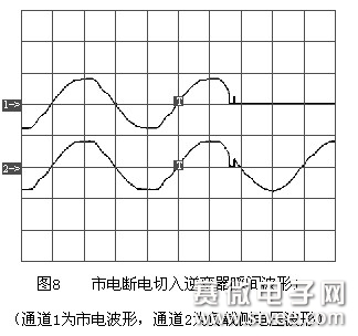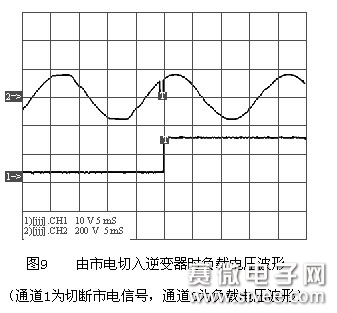 图8为市电断电切入UPS逆变器瞬间波形。图9为由市电切入逆变器时负载电压波形。