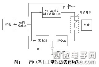 当市电供电正常时如图1所示,连接逆变器的转换开关关断,连接电网的转换开关开通,UPS将原来电压起伏很大的市电经过一种简易的交流稳压器稍加稳压处理后,向用户负载供电。同时经充电器对蓄电池组充电。