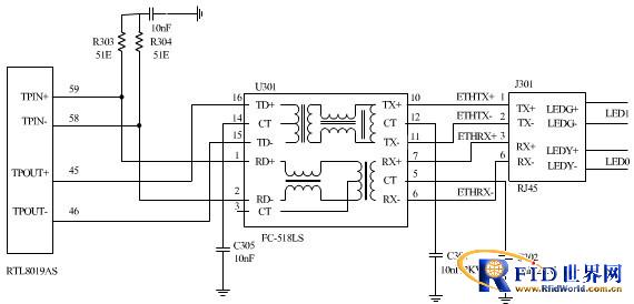 信号的发送和接收端通过网络隔离变压器FC-518LS和RJ45接口接入RTL8019AS,RTL8019AS也带有MII接口,可通过次接口再与S3C44B0X所带MII接口相连,从而组成了以太网信号传输的硬件通道。