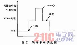 RX850的中断分为直接中断和间接中断两种,直接中断是不受RX850制约的中断句柄,理论上接近硬件中断的速度,其缺点是需要用户自己写中断处理句柄,包括:寄存器压栈;换向,跳转到中断句柄的开始;调用系统命令;返回到调度。间接中断的中断句柄在RX850的中断预处理后才被启动,优点是简化了句柄处理过程,缺点是由于RX850的预处理降低了速度,其处理过程如图1所示。