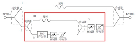 其中通路III、IV构成预失真产生环路,合路后经通路V通过必要的衰减和移相再与通路I的主信号合成最终完成预失真的效果。一般通路IV上的IM3产生器的器件选择都比较严格。