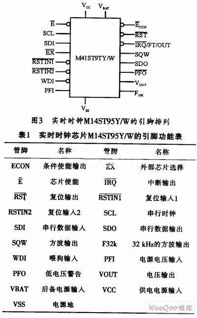 为了使检测仪能自动地记录数据。并提供数据的采集时间以供使用者参考。本系统采用美信公司生产的新型实时时钟芯片M14ST95Y/W,并采用SPI通信协议方式,来减少对系统的端口资源占用,SPI通信只占用系统的SCL、SDI、SDO、片选功能E端以及定时中断信号IRQ。表l所列是M14ST95Y/W的引脚功能,图3为其引脚排列图,M14ST95Y/W内部集成有时钟晶振。同时具有低电压保护功能的电压比较器,当系统供电电压处于低压状态(内部集成1.25V电压比较器)时,系统会自动转入后备电源供电,并在此状态下启动写保护功能,以防止控制器在欠电压运行状态下对实时时钟的错误修改。此外,该芯片还具有看门狗实时复位电路。所以,这款实时时钟芯片资源丰富,功能强大,所需外部分立元件少,可以提高系统的可靠性。