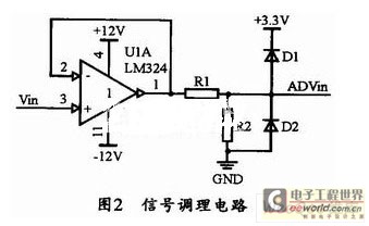 因为从热电耦过来的信号为0~5 V的电压信号,而DSP的A/D采样信号范围只能在0~3.3 V之间。所以,在输入到DSP的A/D电路之前必须经过信号调理,其调理电路如图2所示。图中,运算放大器Ul构成电压跟随器,可提高信号的驱动能力和精度。R1,R2可组成简单的电阻分压网络。其中二极管D1和D2的作用是对DSP的MD进行输入电压的限幅钳位保护。当输入A/D采样电压高于3.3 V时,二极管D1导通,而使输入电压始终不得高于3.3 V,同样的,当低于OV时,二极管D2导通,其输入电压也始终不得低于O V,从而将输入到AD的电压限制在被允许的范围之内。