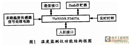 图1所示是该温度监测仪的功能结构框图。图中,该温度监测仪划分为微控制器部分、人机接口、温度传感器信号处理电路、存贮器、实时时钟和通信部分。