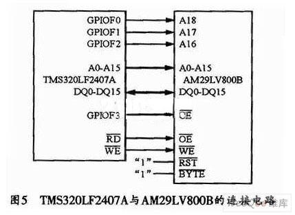 Flash存储器又称闪存,它结合了ROM和RAM的特点,不仅具备电子可擦除可编程(EEPROM)功能,而且断电不会丢失数据,同时又能快速读取数据,具有可在线电擦写、低功耗、大容量、擦写速度快等特点。属于EEPROM的改进产品。AM29LV800B是AMD公司的一种Flash存储器件,其访问时间为90 ns;存储容量为8 Mbit;工作温度范围为-55~+125℃;在线编程电压为3.0~3.6V;而且功耗低;读操作时的电流为7m-A,编程/擦除时的电流为15 mA。图5为DSP与AM29LV800B的连接电路图。