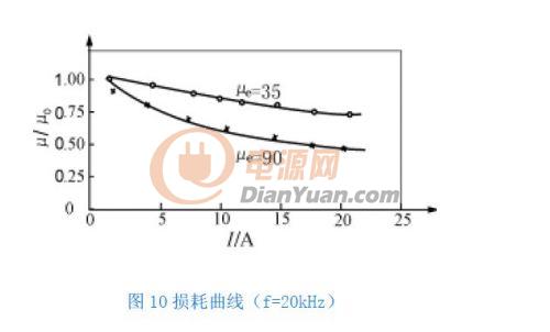FeSiAl 材料很早就被发现有优良的磁性能(可以和坡莫合金相比拟),高μ值(μo=8×104~10×104),低损耗,Bs=1.1T,但由于其脆性,加工困难,而没有大量使用。我所经过几年的研制开发,形成了系列的FeSiAl磁粉心产品,μe=90±5,55±5,35±5,目前进一步推向市场,图8,9 是它们的μe-f曲线和电流特性曲线,可以和2Mo80NiFe相比拟,从图10中所介绍的损耗曲线中可以发现,它的损耗高于坡莫合金磁粉心,但远低于铁粉心,可用在PFC中作电感材料。