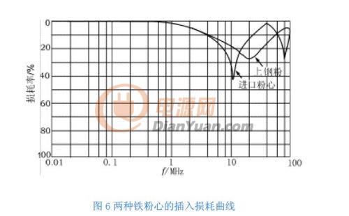但是值得商榷的是,可选择作为滤波器的差模电感的磁粉心不仅仅是μe=75铁粉心一种,图5是铁粉心系列μe=75,μe=55,μe=35磁导率随频率变化的曲线,可见它们磁导率随频率上升而下降的趋势不同。图6是MICROMETARS公司-8(μe=35)和上海钢研精密合金器材研究所SF-33(μe=37.5)铁粉心材料的插入损耗曲线,可见吸收峰出现在不同的频率范围内,因此除了考虑电感量大小,磁饱和问题,价格等因素外,还应该考虑抑制噪声的频率范围,来选择不同型号的铁粉心。
