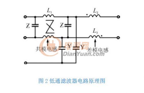无源PFC是一个由电感、电容组成的低通滤波器,如图2所示是一种低通滤波器的电路原理图,其中L1是共模电感,L2,L3是差模电感。