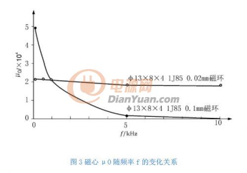 共模电感是完全对称、线圈匝数相同的两个电感线圈,绕在同一个铁心上,电流同方向流经两组线圈后,根据右手螺旋法则,在电感铁心内产生两个方向相反的磁场,由于流经电流大小,线圈匝数完全相同,磁场强度强弱相当,因而完全抵消,不存在磁饱和问题,主要是要考虑电感铁心材料的初始磁导率μo,对于这类材料的μo越高越好,通常有高μo系列的铁氧体磁心,μo=4×103,6×103,8×103,1×104等类型,铁基超微晶材料μo≥5×104,坡莫合金系列如1J79,1J851系列,μo≥5×104。在选择金属磁性材料时必须注意频响问题(见图3)1J79或1J851系列的磁心μo随频率上升而下降的幅度比较大,越薄的材料,μo随频率下降的幅度比较小,设计时应注意这一点。